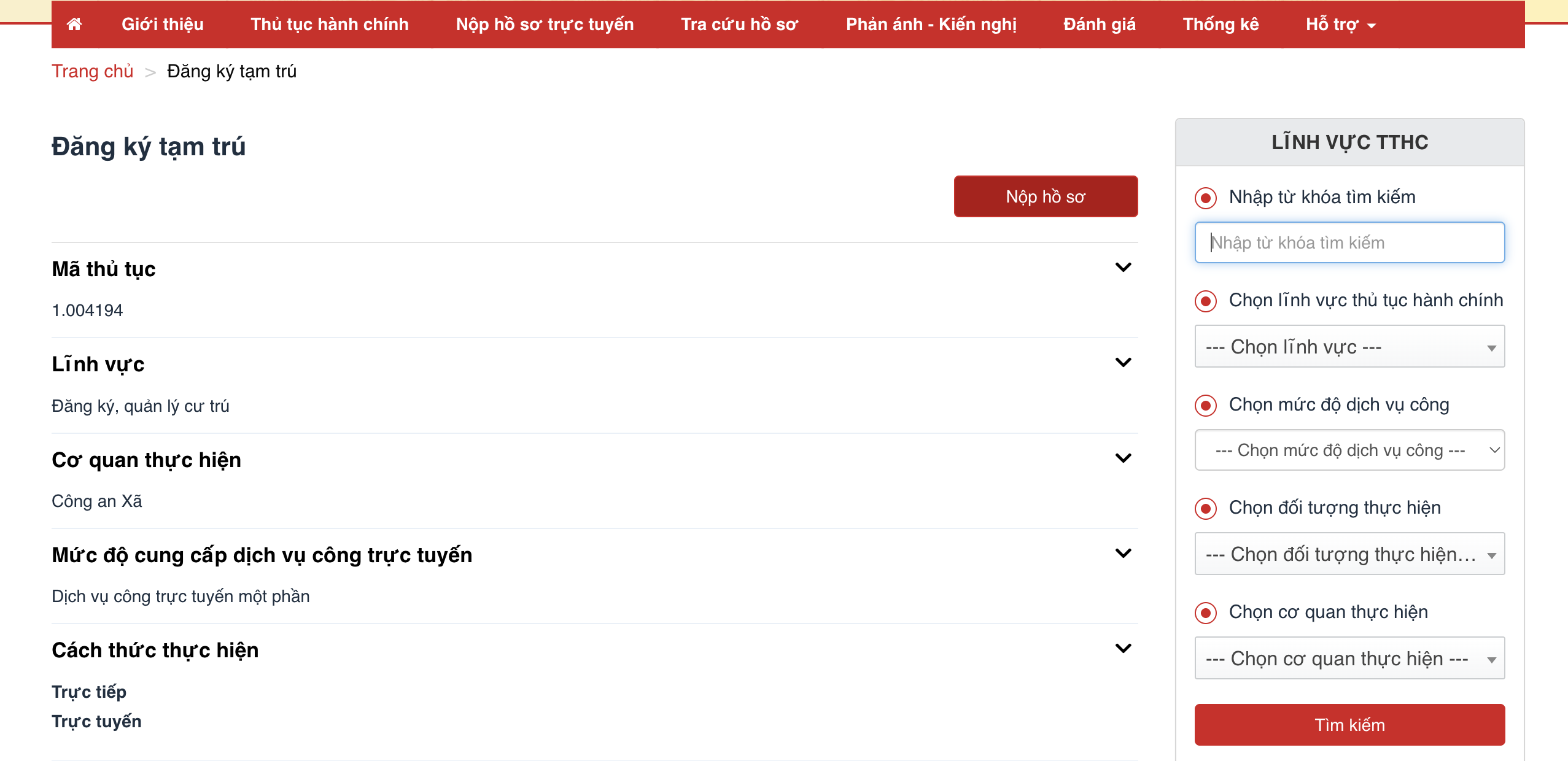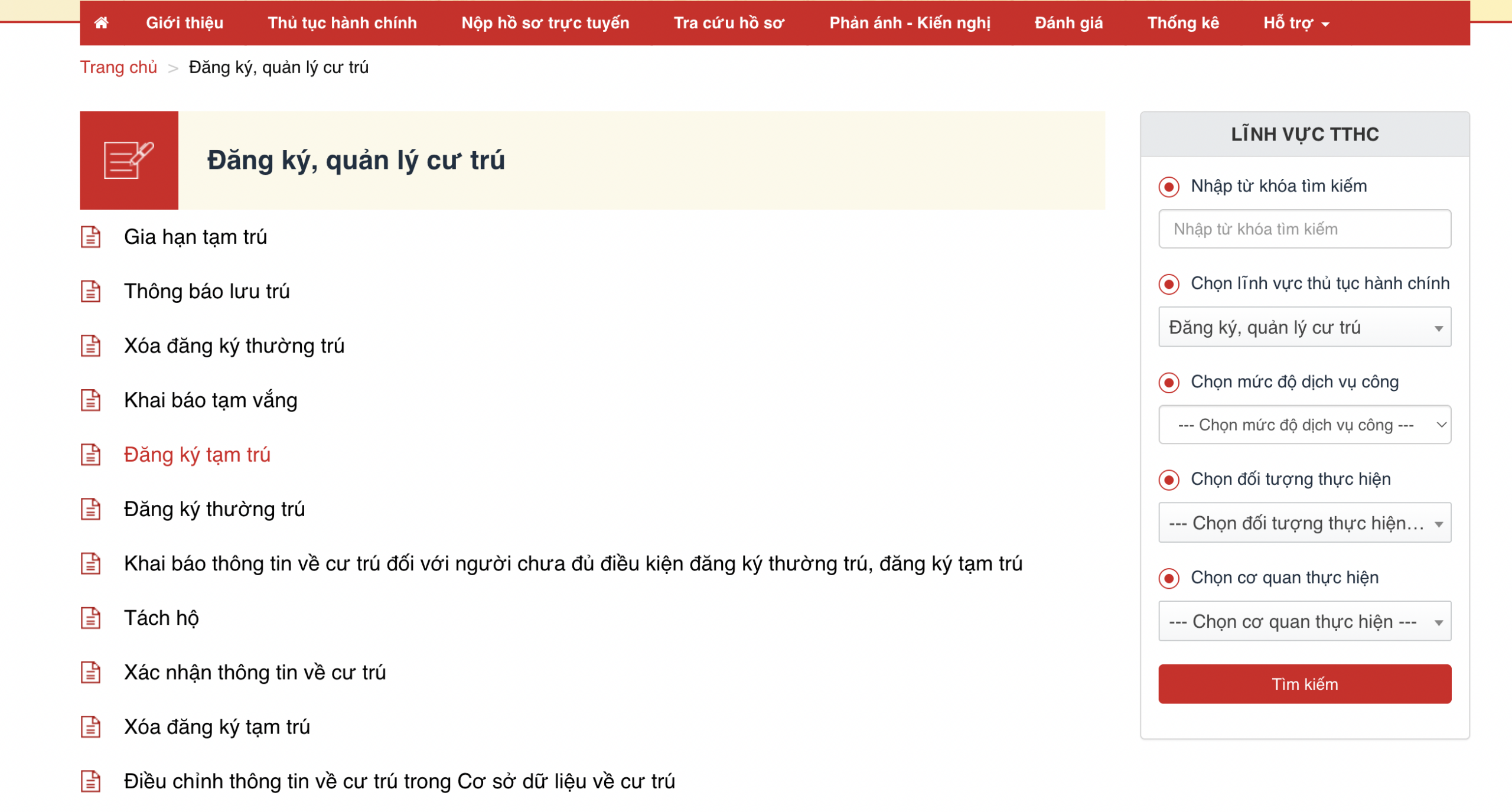 Bước 3: Tìm kiếm thủ tục đăng ký tạm trú