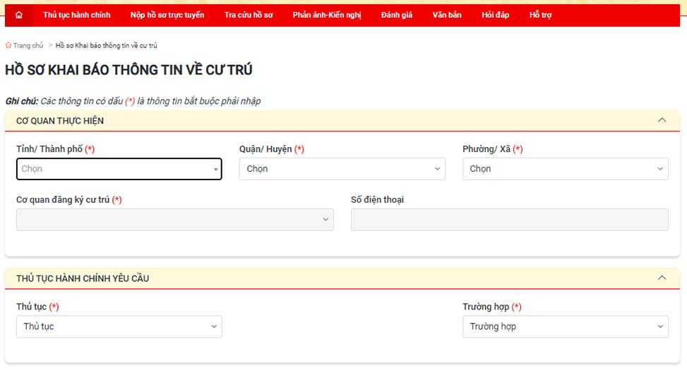 Người dùng điền đầy đủ thông tin gồm: thông tin cá nhân, địa chỉ tạm trú, hồ sơ chứng minh chỗ ở hợp pháp và thông tin nhận kết quả.